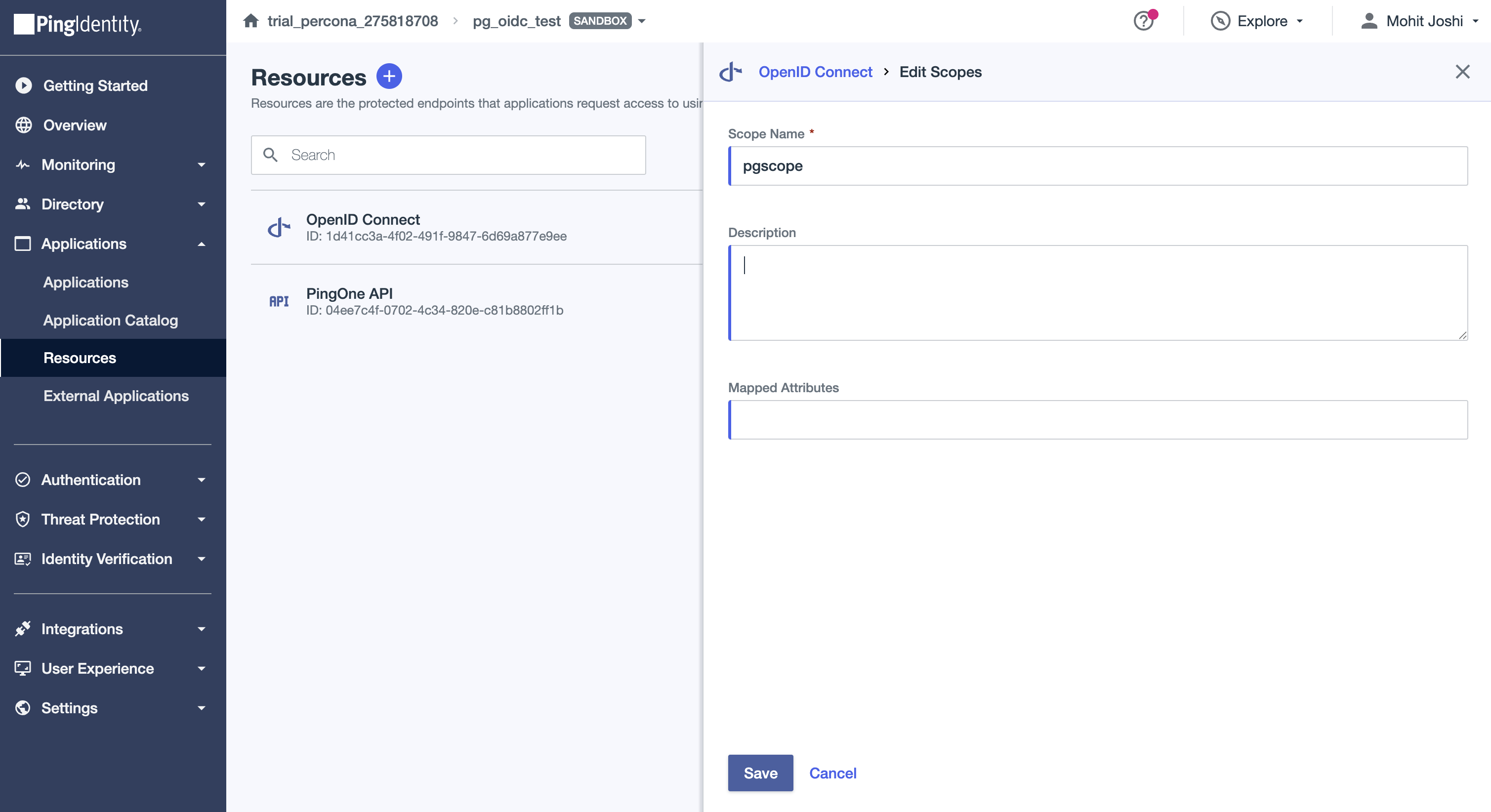 Once the application is successfully created, we need to add a client scope. In the left navigation panel, click on Applications -> Resources -> OpenID Connect. You will see a section called Scopes under which there is a + Add Scope button.