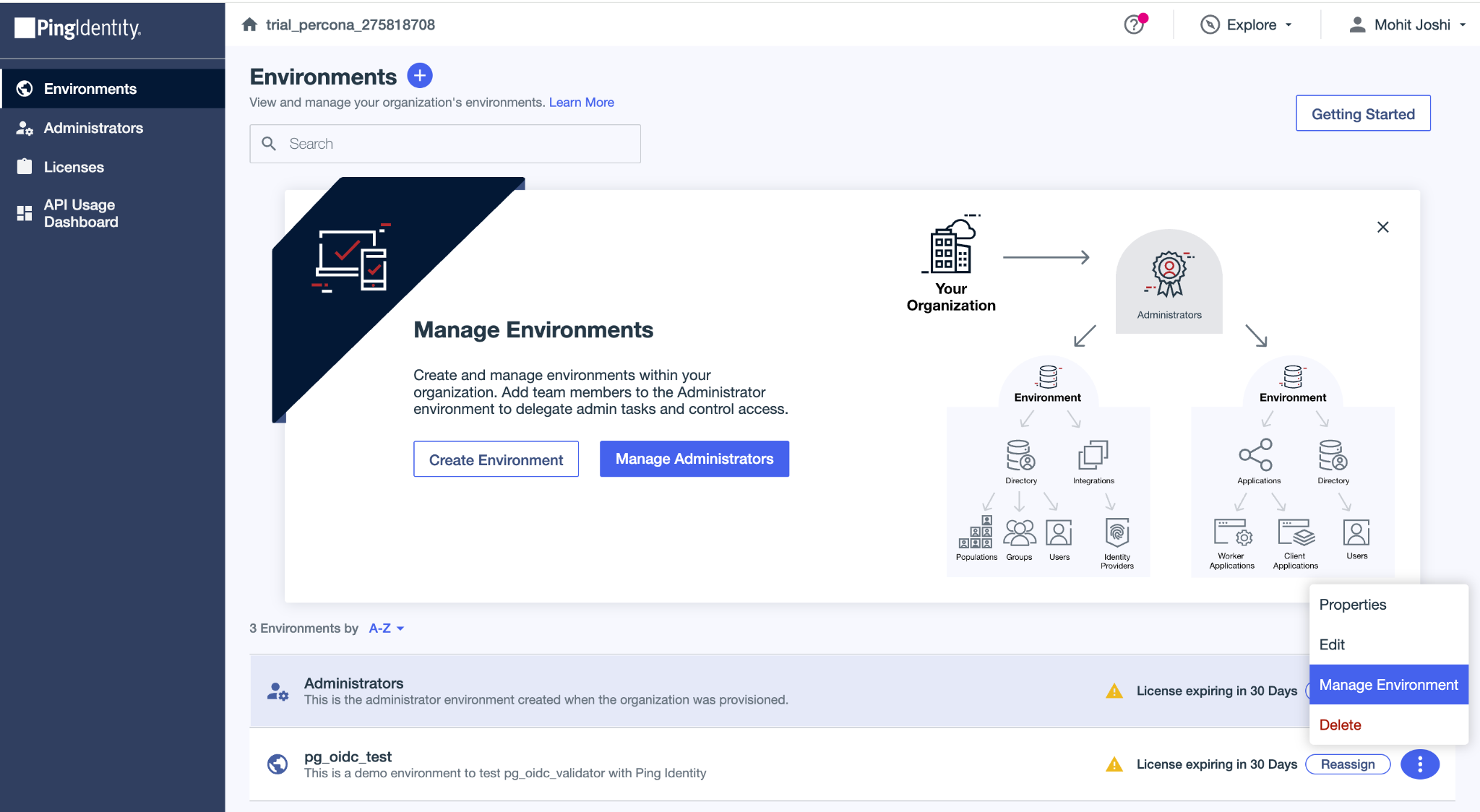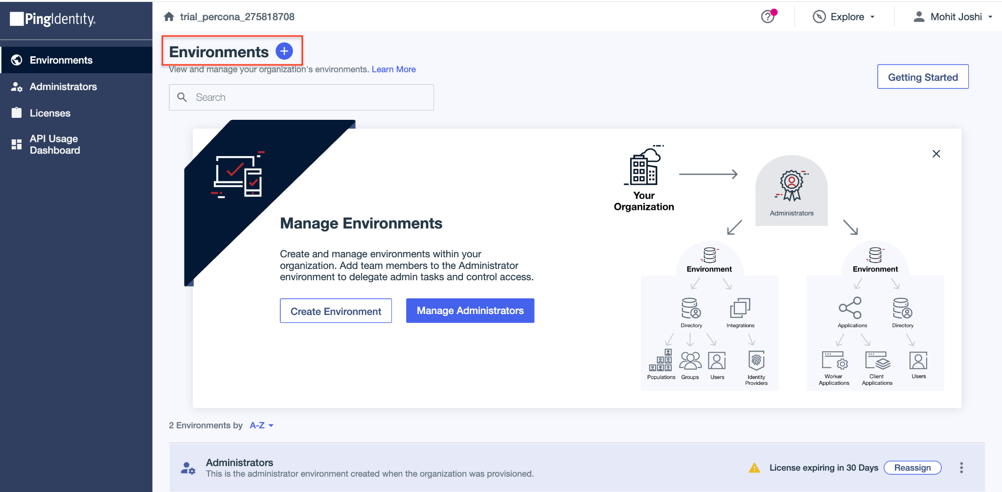 Upon successful Sign-in, we will see Ping Identity Administrator Console. In the left navigation panel, click on Environments -> Environments + (marked in red).