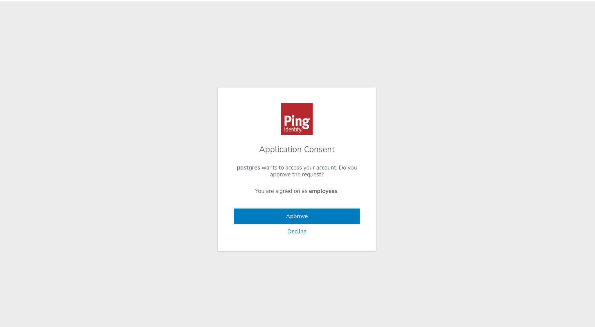 oidc /^(.*)$ employeesNext, edit the authentication configuration file. The configuration file pg_hba.conf acts as a sort of firewall for connections. With the below line, we are instructing PostgreSQL to allow all connections coming from any network that attempt to access the database promo as user employees using the new authentication method oauth. We are also indicating that the authentication provider is Ping Identity and the scope is openid.