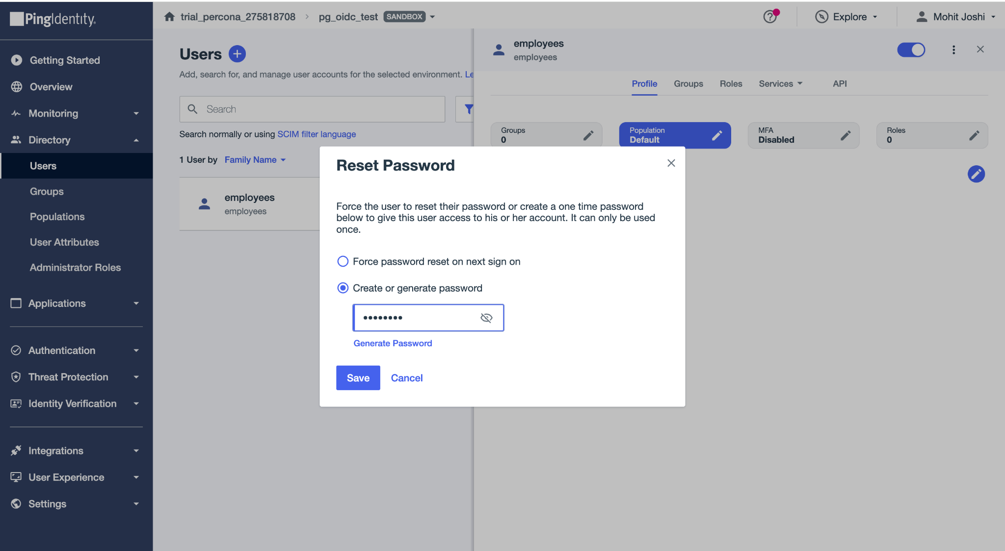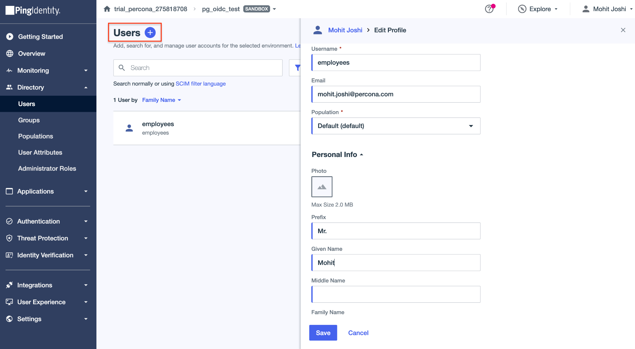 Fill the username field. For our exercise, we are creating a user called employees. In some identity providers (IdPs), it is possible to customize tokens and control how certain claims (including the sub - subject claim) are generated or mapped. However, it is important to note that while Ping Identity allows customization of the ID token, the access token claims (including sub) for the default OpenID Connect resource cannot be customized. The value of sub in the access token is generated and managed internally by PingOne and cannot be altered, mapped, or derived from another attribute (such as email or username). As a result, PostgreSQL must be configured to work with the sub value exactly as issued in the access token by PingOne.