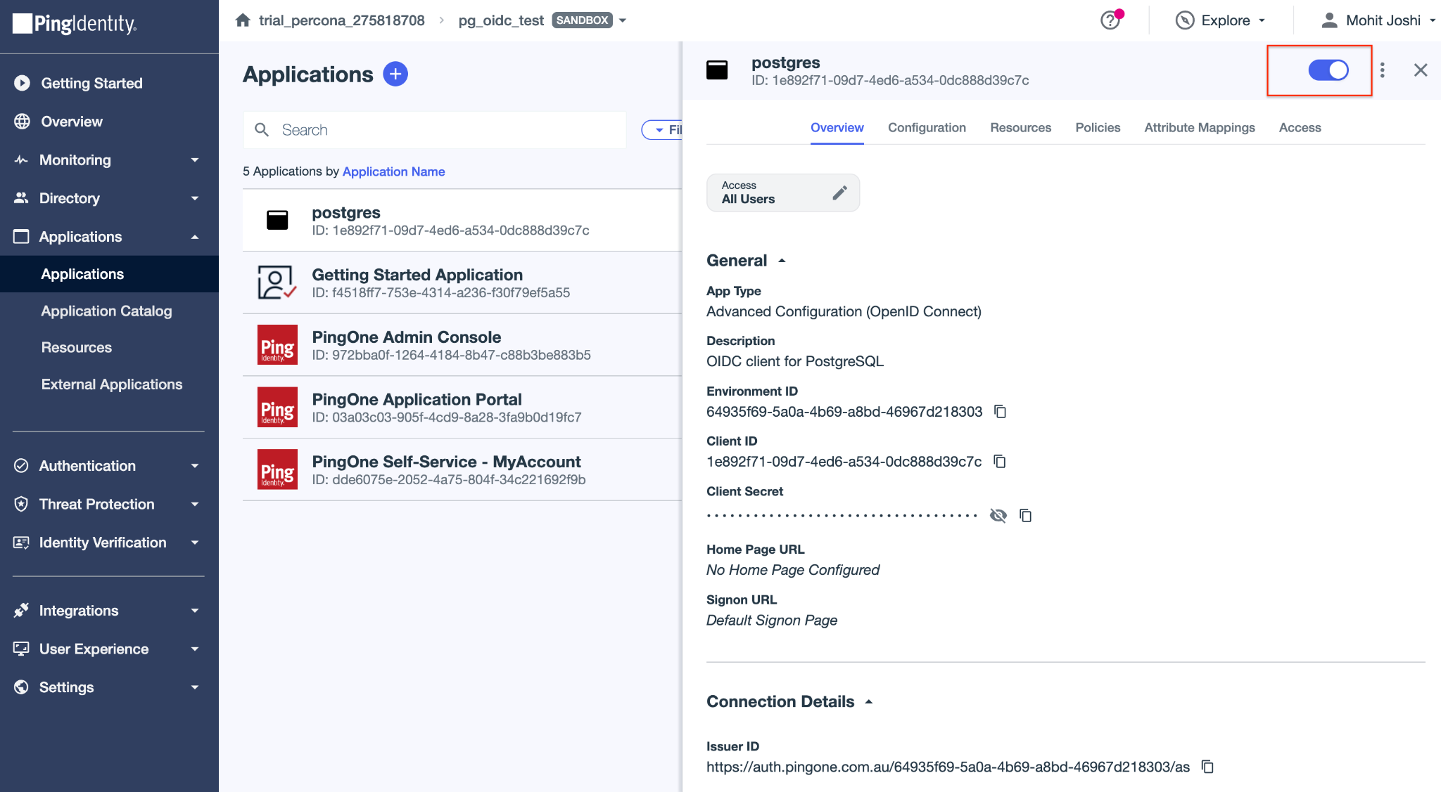 Upon successful creation, we will see generated Client ID and Issuer ID. The Issuer ID can be copied from under the Connection Details section. Enable the toggle so that the application is Active.