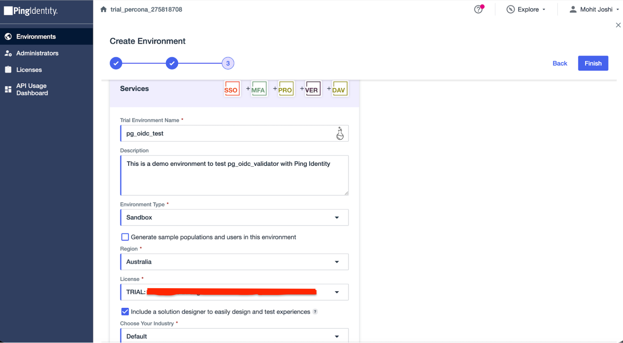 Provide an environment name and click on Finish