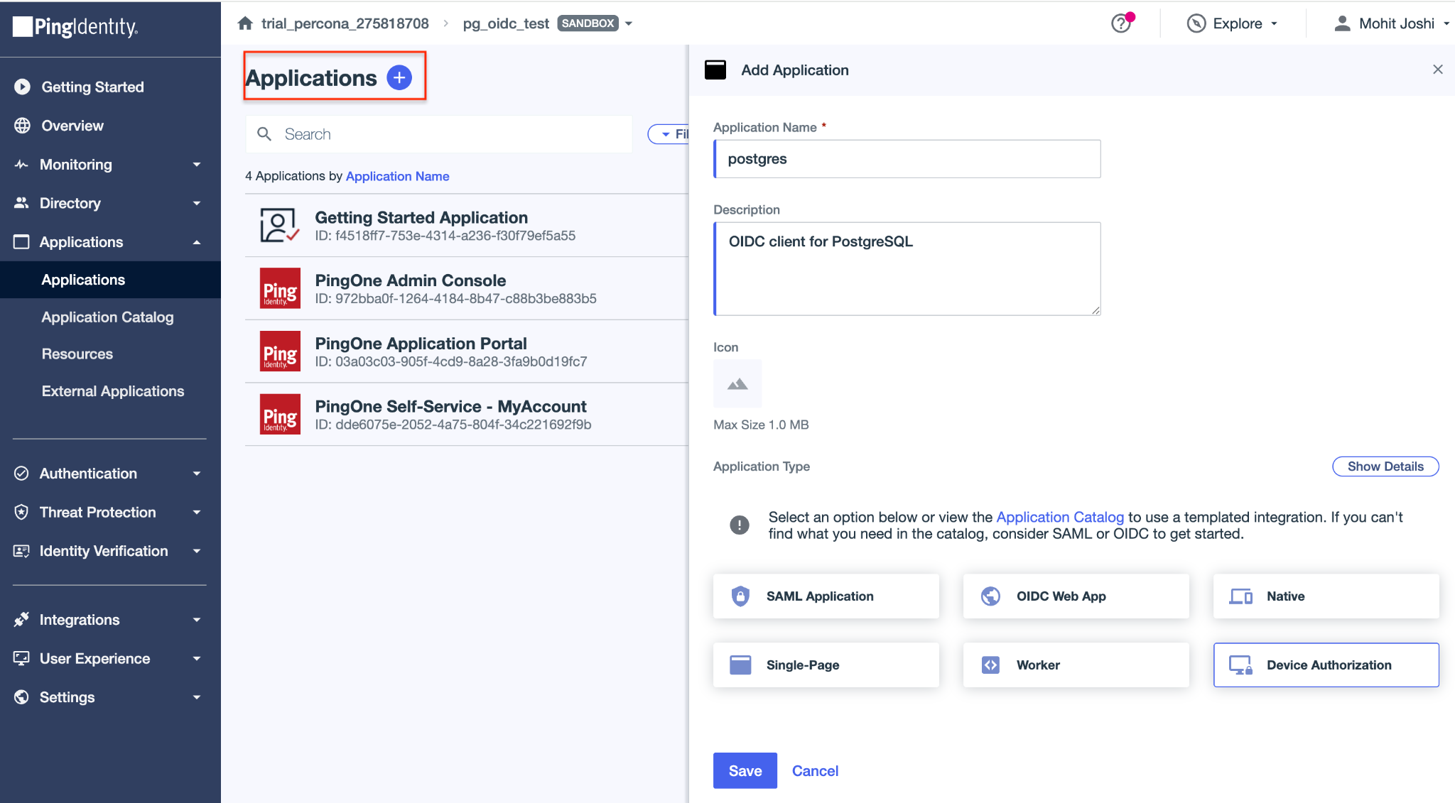 In the left navigation panel, click on Applications -> Applications -> click on Applications +. Fill the application name, select the application type as Device Authorization and click on Save.